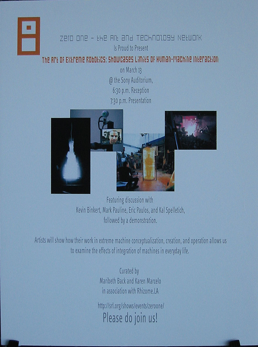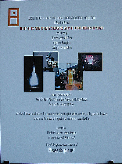 Discussion with Kevin Binkert, Mark Pauline, Eric Paulos, Kal Spelletich Curated by Karen Marcelo and Maribeth Back