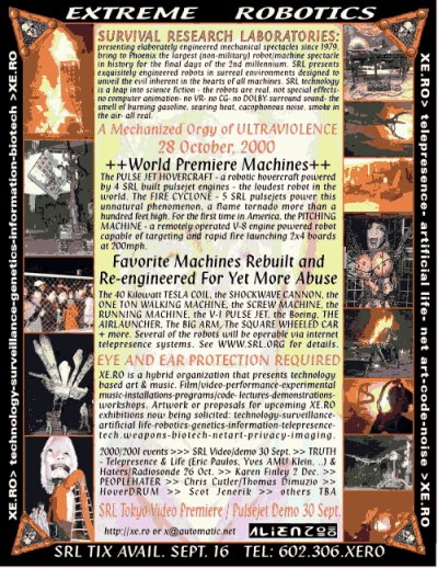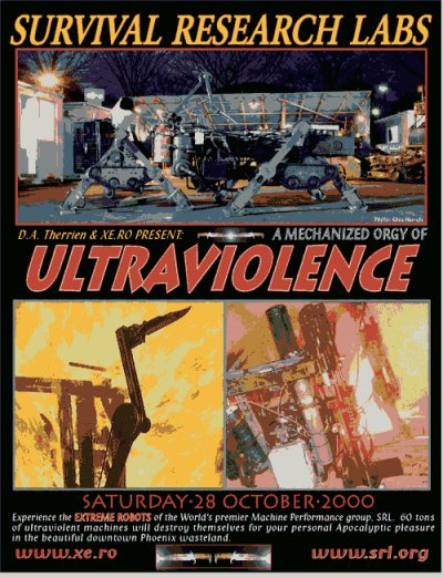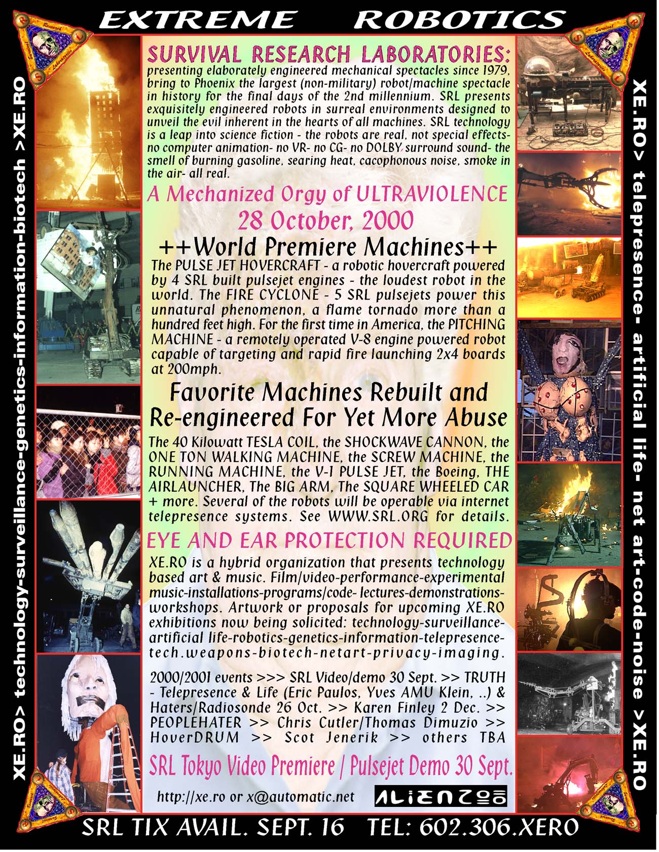 SURVIVAL RESEARCH LABORATORIES:presenting elaborately engineered mechanical spectacles since 1979, bring to Phoenix the largest (non-military) robot/machine spectacle in history for the final days of the 2nd millennium. SRL presents exquisitely engineered robots in surreal environments designed to unveil the evil inherent in the hearts of all machines. SRL technology is a leap into science fiction - the robots are real, not special effects-no computer animation- no VR- no CG- no DOLBY surround sound- the smell of burning gasoline, searing heat, cacophonous noise, smoke in the air- all real.